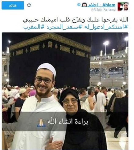 ونشرت أحلام صورة للنجم على موقع "تويتر" أثناء أدائه مناسك العمرة برفقه والدته، وكتبت عليها: "الله يفرجها عليك ويفرّح قلب اميمتك حبيبي أمنتكم أدعوله براءة إن شاء الله".