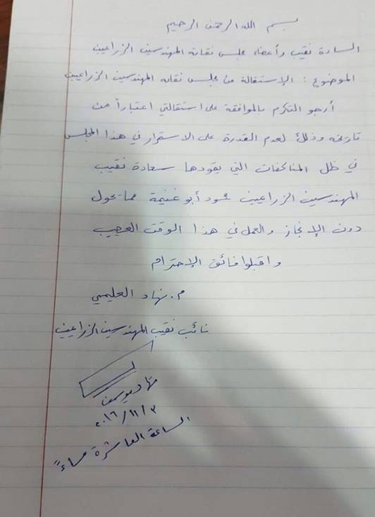 وقال العليمي في استقالته إنه لم يعد قادرا على الاستمرار في ظلّ المناكفات التي يقودها نقيب المهندسين الزراعيين المهندس محمود أبو غنيمة.