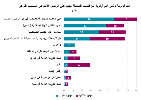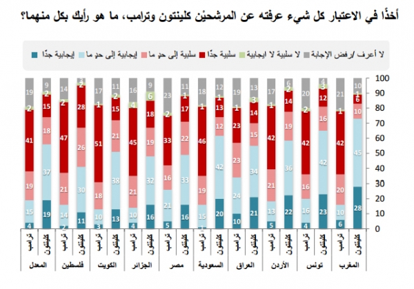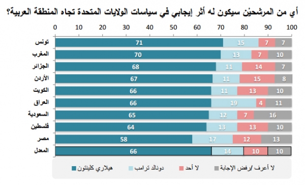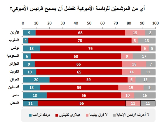 جاء ذلك في استطلاع للرأي حول رأي العرب في الانتخابات الأمريكية واجراه المركز العربي ومقره واشنطن ، في 8 دول عربية هي الاردن والمغرب وتونس ومصر والعراق وفلسطين والكويت والجزائر ، على عينة تعدادها 3600 شخص بمعدل 400 شخص من كلدولة .