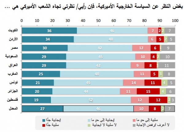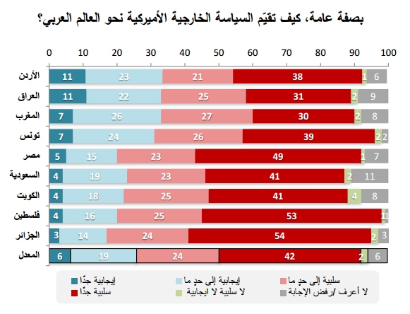 وقال 38 % من الاردنيين ان السياسية الخارجية للولايات المتحدة نحو العرب سيئة جدا ، و21 % منهم انها سلبية الى حد ما ، فيما قال 11 % من الاردنيين انها ايجابية جدا ، و23 % انها ايجابية الى حد ما ، في قال 1 % من الاردنيين انها لا سلبية ولا ايجابية ورفض 6 % منهم الاجابة على السؤال .