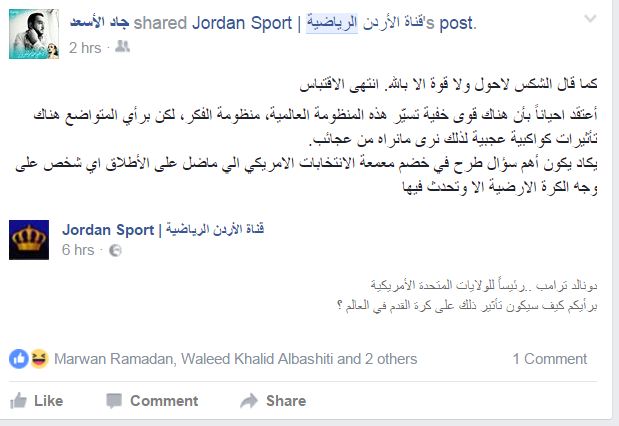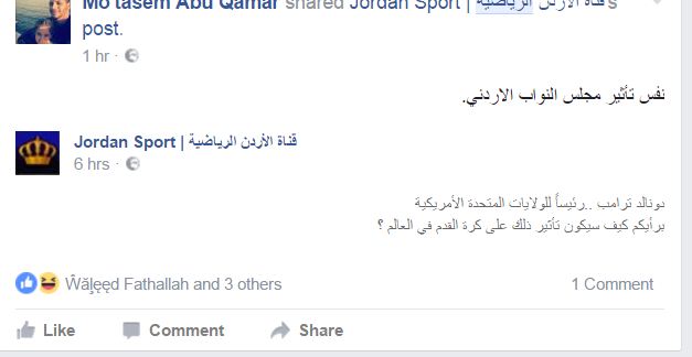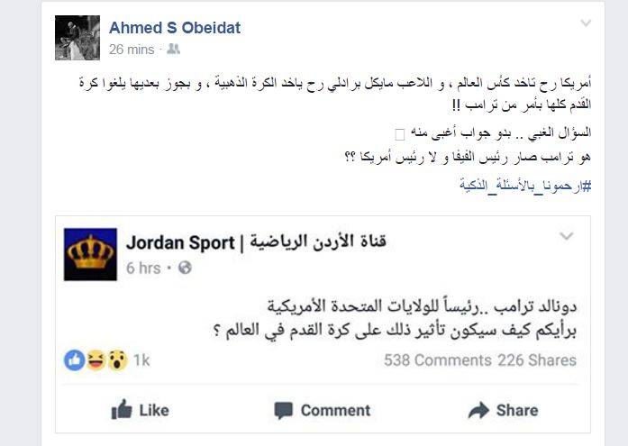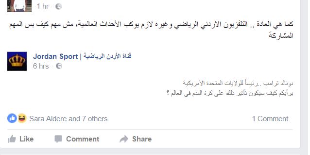 مجاهد جرار - موجة سخرية عمّت مواقع التواصل الإجتماعي على قناة الأردن الرياضية ، ردا على طرحا استفسارا على متابعيها (دونالد ترامب ..رئيساً للولايات المتحدة الأمريكية برأيكم كيف سيكون تأثير ذلك على كرة القدم في العالم ؟) ، ومن التعليقات على الصفحة: فضحتونا ، زي فوائد الميرامية , فيما عبر الآخرين عليها بشكل أدبي أكثر ، مرفقا بعضا من هذه التعليقات: