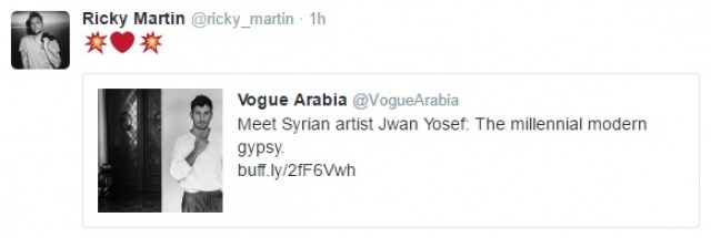 فاجأ الفنان العالمي ريكي مارتن جمهوره على "تويتر"، بعدما نشر تغريدة، دعم من خلالها حبيبه الرسام السوري ايوان يوسف.