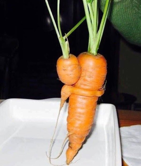 5- بالتأكيد ترى كماً من المشاعر الجياشة في هذه الجزرة حيث يشعر الناظر إليها أنها عبارة عن طفل من الجزر يتعلق بأمه الجزرة الكبيرة بل ويقبلها على جبينها. استيقظ يا صديقي فهي ليست سوى جزرة غريبة الشكل.