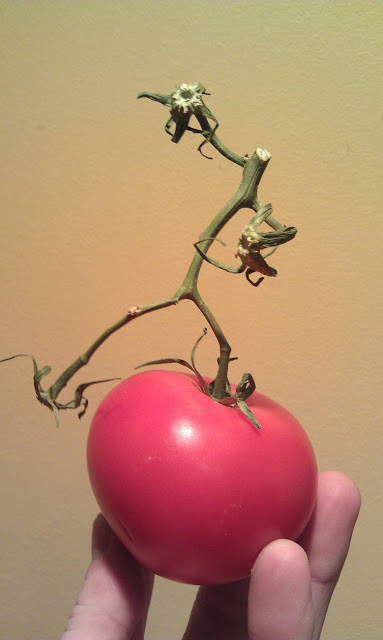 1- تبدو هذه القطعة الخضراء على رأس ثمرة الطماطم وكأنها شخصية كرتونية تقف بقدمها على ثمرة الطماطم. وهذا ما يخيله لنا عقلنا بينما الحقيقة هي أنها مجرد غصن أخضر لا أكثر.