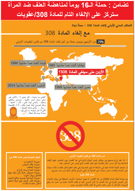 تعلن كل من جمعية معهد تضامن النساء الأردني "تضامن" والتحالف المدني الأردني لإلغاء المادة 308/عقوبات والذي يضم حتى تاريخه 106 منظمات مجتمع مدني إستمرار حملتهما لإلغاء المادة 308 من قانون العقوبات الأردني للسنة الثانية على التوالي، كجزء من حملة الـ 16 يوماً العالمية لمناهضة العنف ضد المرأة ، والتي تمتد بين 25 تشرين الثاني (اليوم الدولي للقضاء على العنف ضد المرأة) و10 كانون الأول (اليوم العالمي لحقوق الإنسان).