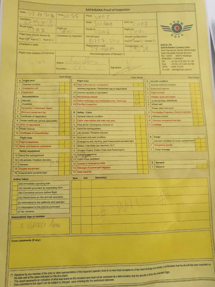 في إطار حملاتها المعتادة في اوروبا قامت منظمة السلامه العالمية safa بإحدى جولاتها المفاجئةفي مطار اسطنبول بالتفتيش اثناء وجود احدى طائرات فلاي جوردن في مطار "صبيحة" ووجدتها مطابقة لمواصفات السلامة الجوية الاوروبية والعالمية دون أن تبدي ادارة المنظمة أية ملاحظات على الطائرة، مؤكدة بأن الطائرة وهي من نوع (boing 300-737) تتفق وشروط السلامة التي حددتها المنظمة.