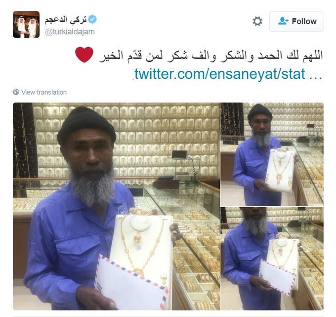 لم يكد السعوديون ينسون مقطع مهندسي الجبيل الصناعية، وهم يودّعون عامل النظافة، الـ "زميل لهم" في لفتة إنسانية لا تتكرر في كثير من دول العالم، حتى هبوا مرة أخرى ليتفاعلوا بإنسانية مع صورة تم تداولها لعامل نظافة وقف أمام مجموعة من أطقم الذهب المعروضة على نافذة عرض أحد المحال المتخصصة في بيع الحلي والمجوهرات