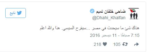 وقال خلفان في تغريدة جديدة على التوتير: "هناك شيء ما سيحدث في مصر ...سيفرح السيسي. هذا والله اعلم".