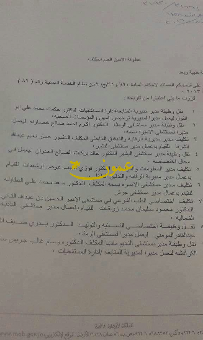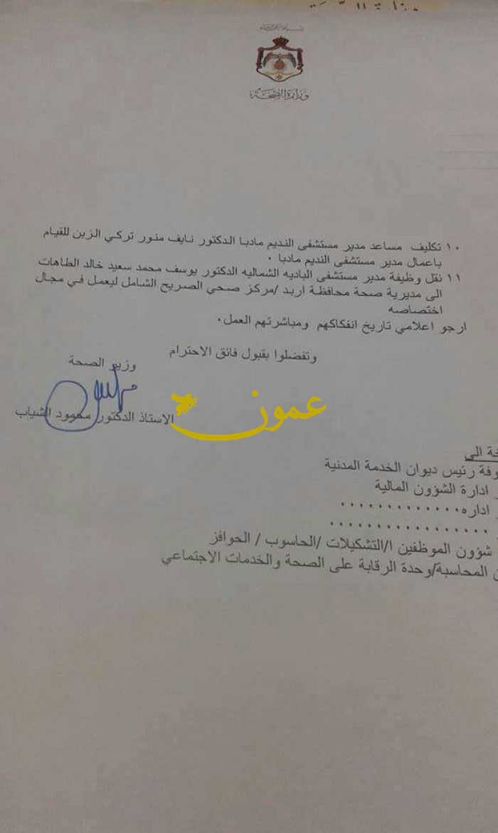 - قرر وزير الصحة الدكتور محمود الشياب اجراء تنقلات شملت 11 مدير اعتبارا من تاريخ اليوم الثلاثاء 27/12/2017 وعلى النحو التالي :