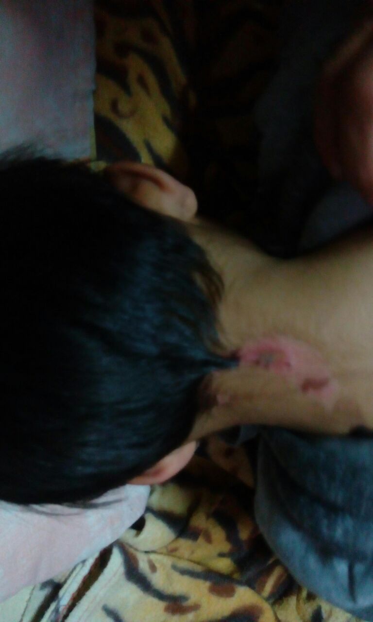 في بداية القصة قال الطفل ان زوجة ابيه قد سكبت عليه الماء الساخن وهذا ما تدل عليه الصور وجهه رقبته ورجله (حرق درجة ثانية) حسب رواية الام لـ احداث اليوم.