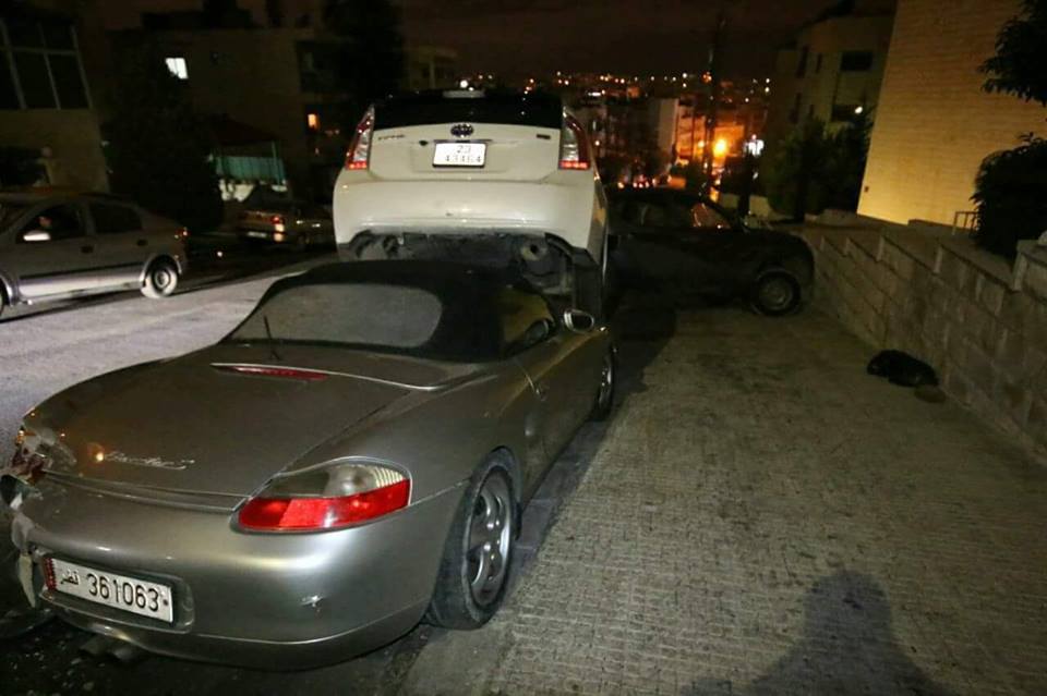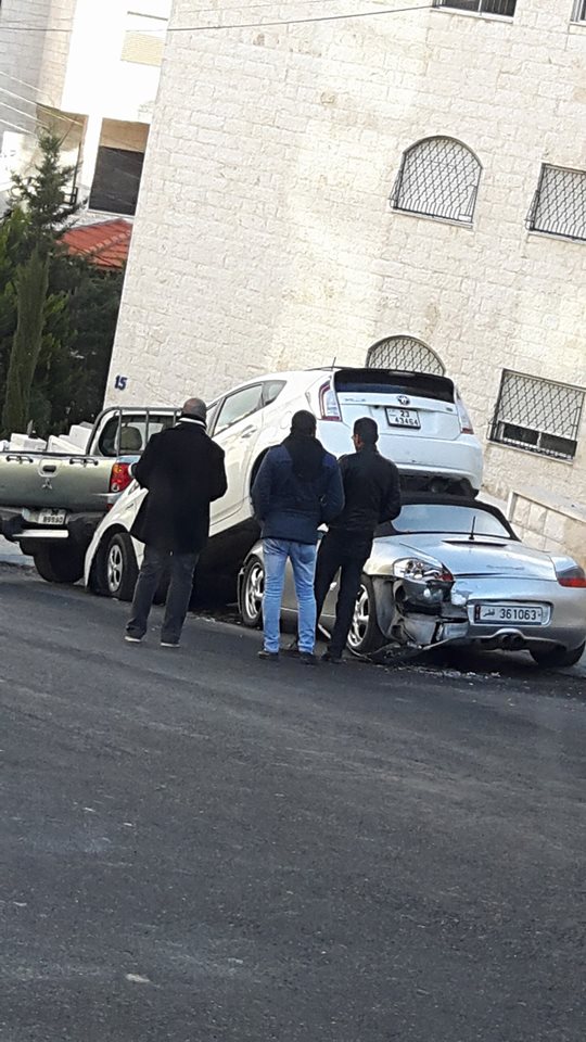 حادث سير أشبه بمشهد سينمائي وقع في منطقة الشميساني في العاصمة عمان فجر الأحد، وبقي مشهده راسخا حتى ساعات الظهيرة، إذ توغلت مركبة من جنسية عربية بأخرى كانت تصطف أمام عمارة سكينة وارتطمت بثالثة كانت تقف أمامها بسلام.