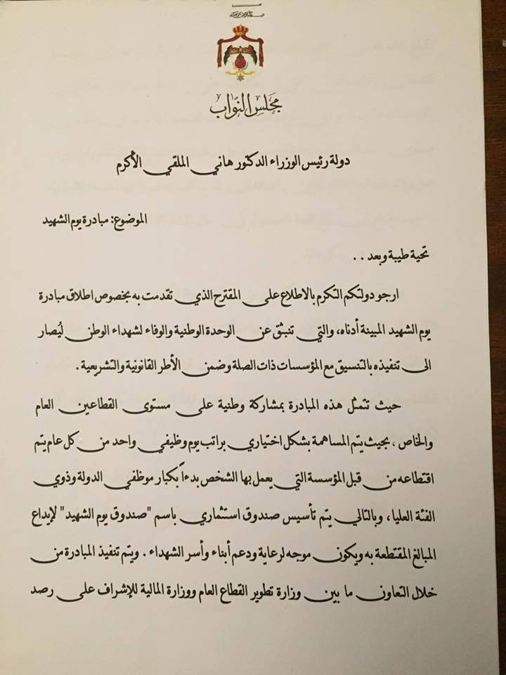 حيث كنت قد تقدمت بتلك المبادره في الأسبوع السابق الى دولة رئيس الوزراء لإطلاق " صندوق يوم الشهيد " و التي كنت قد أعلنت عنها على صفحتي و مكتبي الاعلامي بتاريخ 25 /12 مع تفاعل كبير جدا لأبناء الوطن.