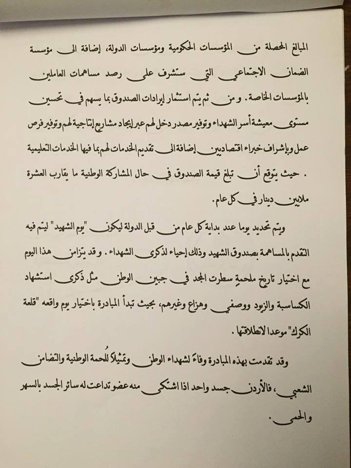 و تأني هذه اللفته الملكية السامية بالموافقه على مضامين المبادره. و من ضمن ذلك تحفيز القطاع الخاص للمساهمه الفاعله في دعم الصندوق في " يوم الشهيد " .
