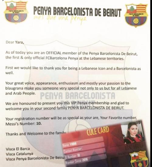 تلقّت الفنانة يارا بطاقة الإنتساب الرسمية لرابطة مشجعي فريق برشلونة في بيروت حيث كان لافتاً أن رقم عضويتها هو "10" وهو رقم قميص اللاعب الأرجنتيني ليونيل ميسي.