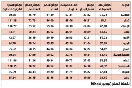 أما بين الدول العربية، فكانت الكويت في المرتبة الأولى، إذ سجّلت 75.24 في مؤشر غلاء المعيشة (أي 24.76% أقل من المركز العالمي)، تلتها كلٌّ من قطر (69.20) والإمارات (67.98).