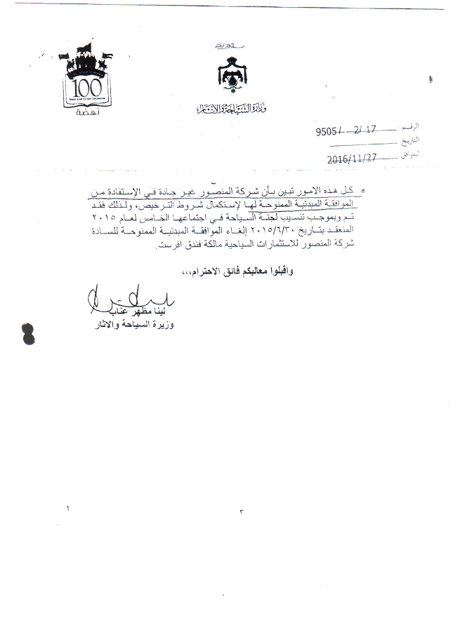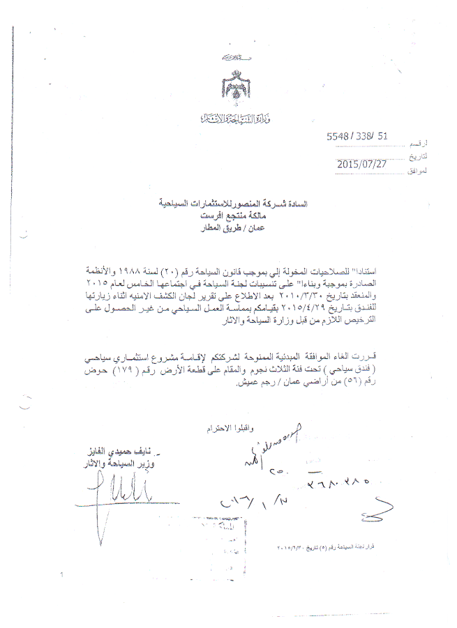 علمت شركتنا (شركة إفرست لإدارة الأجنحة الفندقية) خلال زيارة مندوب الشركة إلى وزارة السياحة والآثار الموقرة في بداية شهر حزيران (6) من العام 2015 بأنه قد صدر قرار من الوزارة بإغلاق مبنى إفرست السياحي بسبب انتهاء الموافقة المبدئية الممنوحة للمبنى والصادرة بإسم الشركة مالكة المبنى (شركة المنصور للإستثمارات المتعددة) والتي يملكها عراقيون وذلك بسبب رفض شركة المنصور الإلتزام بتنفيذ متطلبات الموافقة المبدئية المذكورة بقصد أن يتسببوا بإغلاق المبنى تمهيداً لبيعه ، وبناءً عليه قامت شركتنا شركة إفرست وبصفتها المستثمر والمشغل الفعلي للمبنى بمراجعة أمين عام وزارة السياحة وأوضحت له كافة التفاصيل المتعلقة بالموافقة المبدئية ، وبأن هناك قضية تحكيمية منظورة بين شركتنا وشركة المنصور ولا علاقة لوزارة السياحة بهذه القضية لا من قريب ولا من بعيد وأننا ننأى بوزارة السياحة الموقرة أن تُقحمُ نفسها بين متخاصمين وتقف بغير حياد مع طرف ضد الطرف الثاني!!!، ولأننا لا نرى سوى القانون حَكماً بيننا كمواطنين ، ولا نرى سوى الدستور فيصلاً في النزاعات، فلسنا أهل بلطجة ولا أهل فساد ، إلا أن شركتنا شركة إفرست لم تصل إلى أي نتيجة إيجابية معه (وهنا لا يفوتني أن أذكر بأن أمين عام الوزارة ركز وبشدة لمعرفة من أبلغ شركتنا بقرار الإغلاق الذي صدر مسبقاً وأصبحت المشكلة لديه من أبلغنا بالقرار !!!!، ولم يعطي الأمين العام أي اهتمام الى القرار نفسه وعواقبه وتبعاته في حال إغلاق مبنى إفرست والذي سيتشرد بسببه عائلات أردنية لا ذنب اقترفته ، بالإضافة إلى الخسائر الفادحة التي ســيتــسبب بها هذا القرار للشـــركة الأردنية ، وأصبحـت القضـية لديه كيف علمنا بالقرار ومن أعلمنا به ؟ ( درء المفاسد أولى من جلب المصالح يا عطوفة الأمين العام ) وهنا تأكدنا أن النية المبيتة كانت مفاجأتنا بإغلاق المبنى وينتهي معهم الأمر على ذلك !!!!) ومن باب حسن النية بالنظر إلى موقف أمين عام الوزارة نعتقد أن السبب في ذلك كان بأن أحد المسؤولين وبرفقة العراقيين قاموا بزيارته مسبقاً حسب ما علمنا من الأمين العام للوزراة ومعهم محامي العراقيين، ويبدو لنا أنهم قاموا بإقناعه بطريقة أو بأخرى بضرورة إصدار قرار الإغلاق وتنفيذه على المبنى بالسرعة القصوى!!! ( وكأن شركة افرست المستثمرة والمشغلة الفعلية للمبنى هي وموظفيها خلايا سرطانية يجب إزالتها والتخلص منها فوراً!!!!! )