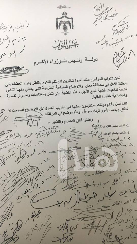 وقال النواب في المذكرة " نحن النواب الموقعين أدناه نغدوا شاكرين لدولتكم النظر بعين العطف الى معاناة الأهل في محافظة معان والأوضاع المعيشية المتردية التي يعاني منها الناس نتيجة تداعيات قضية "البيع الآجل"".