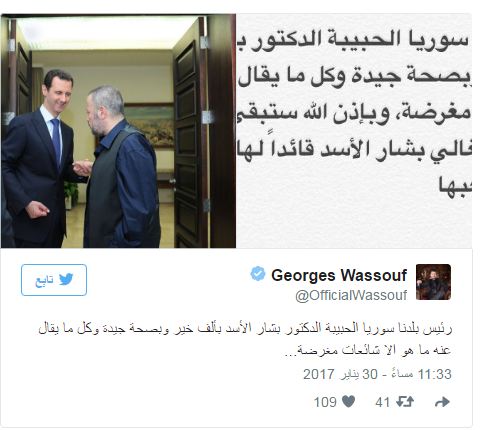 تناول الفنان السوري جورج وسوف عبر حساباته الرسمية على مواقع التواصل الاجتماعي الأخبار التي تطرقت الى "صحّة" رئيس النظام السوري بشار الأسد، وتعرضه لجلطة، ليؤكد أنها شائعات مغرضة.
