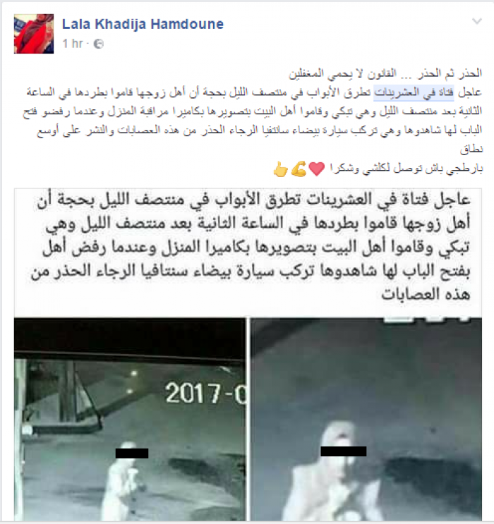 وقال الناشطون ان الفتاة تقوم بطرق أبواب المنازل بعد منتصف الليل مدعية ان اهل زوجها قاموا بطردها.
