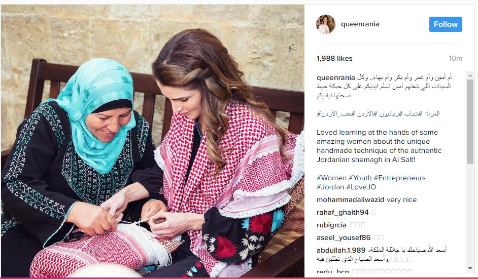 وعلقت جلالتها على الصورة التي جمعتها بسيدة من سيدات السلط، " ام امين وام عمر وام بكر وام بهاء ... وكل السيدات اللي شفتهم أمس، تسلم ايديكم على كل حبكة خيط نسجتها اياديكم".