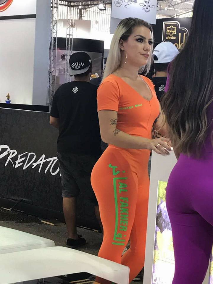 ويظهر في الصور المتداولة ,صورا لفتيات يحملن اسم المنتج في أحد المعارض بدولة الكويت على ملابسهّن غير المحتشم .
