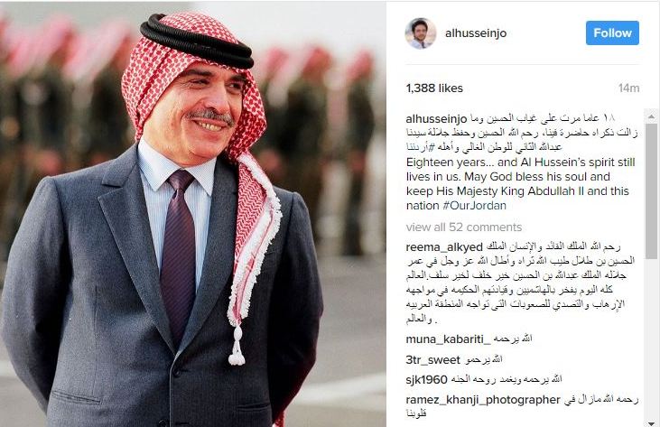 نشر سمو الامير الحسين بن عبد الله الثاني ولي العهد صورة في حسابه الخاص على الانستغرام صباح الثلاثاء للملك الراحل الحسين طيب الله ثراه، حيث كتب عليها