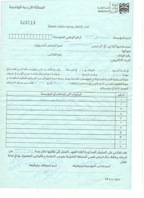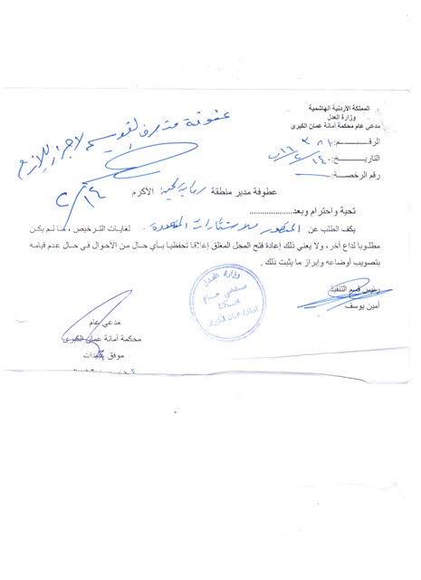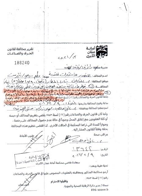 ومع ذلك لم يتراجعوا عن إغلاق المبنى كاملاً ، وأعلمناهم بأنه كان يجب على الأمانة / دائرة المهن حصراً وطبقاً للقانون (توجيه مخالفة أو إنذار مسبق) بسبب عدم تجديد رخصة المهن لو كان واقع الحال كذلك إستناداً لأحكام المادة 13 من قانون رخص المهن لمدينة عمان وتعديلاته رقم 20 لسنة 1985، وهذا لم يتم نهائياً خلال عدة زيارات ولأنهم على يقين تام بأن المبنى مرخص برخصة سارية المفعول، وعليه وبعد موافقتهم على الإنتظار لحين انتهاء الحفلات قام مدير عام شركتنا آنذاك السيد عمار العجلوني المحترم بالإتصال بعطوفة متصرف لواء القويسمة الأكرم بصفته من أصدر أمر تنفيذ الإغلاق بناءً على الأوراق التي وردته من دائرة الرقابة الصحية وأوضح له المدير العام نية موظفي الرقابة بإغلاق كامل المبنى وليس إغلاق المطعم فقط ، وحينها طلب عطوفة المتصرف مشكوراً من المدير العام لقائه فوراً بمبنى المتصرفية ليتمكن المتصرف من تعديل كتاب التنفيذ الموجود مع موظفي الرقابة ليصبح إغلاق للمطعم فقط وحسب ما ورده من أوراق ، ولكن للأسف الشديد تفاجأ كل من عطوفة المتصرف والمدير العام بعد النظر على الملف بأن مديرة الرقابة الصحية قامت بتزويد عطوفة المتصرف الأكرم بتقرير مخالفة لقانون الحرف والصناعات يحمل الرقم 188240 محشو بين أسطره وبشكل فاضح بند " 2 عدم الحصول على الترخيص لممارسة المهنة لعام 2016 بمهنة ( بركة سباحة + صالة افراح + مطعم سياحي + نادي صحي وبذلك مخالف لقرار اللجنة اللوائية رقم 9 وقرار رقم 40 بتاريخ 10/1/2016 بعدم ممارسة المهنة المذكورة بالبند 2 من المخالفة وبموجب قرار اللجنة اللوائية المرفق صوره عنه ماده 5 من الحرف والصناعات ) " .