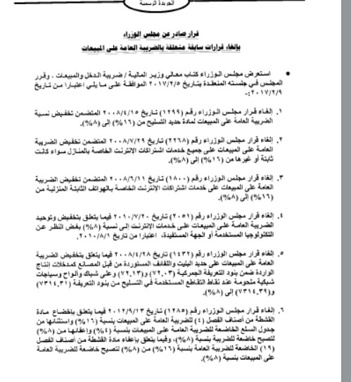 نشرت الجريدة الرسمية على موقعها الرسمي، قرار صادر عن مجلس الوزراء بإلغاء قرارات سابقة متعلقة بالضريبة العامة على مبيعات بعض السلع التجارية.