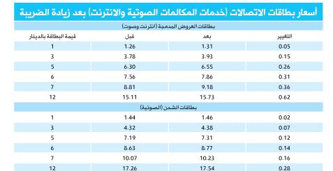 وبالنسبة لبطاقة "6 دنانير" فقد كان سعرها قبل الضريبة 8.63 دينار، وارتفع بعد زيادة الضريبة إلى 8.77 دينار بمقدار تغير وزيادة 14 قرشا، وبطاقة "7 دنانير" كان سعرها 10.07 دينار، وارتفع سعرها بعد الضريبة الجديدة إلى 10.23 دينار بمقدار تغير 16 قرشا، وأما بطاقة "12 دينارا" فقد كان سعرها 17.26 دينار، وارتفع سعرها إلى 17.54 دينار بعد زيادة الضريبة بمقدار زيادة 28 قرشا.