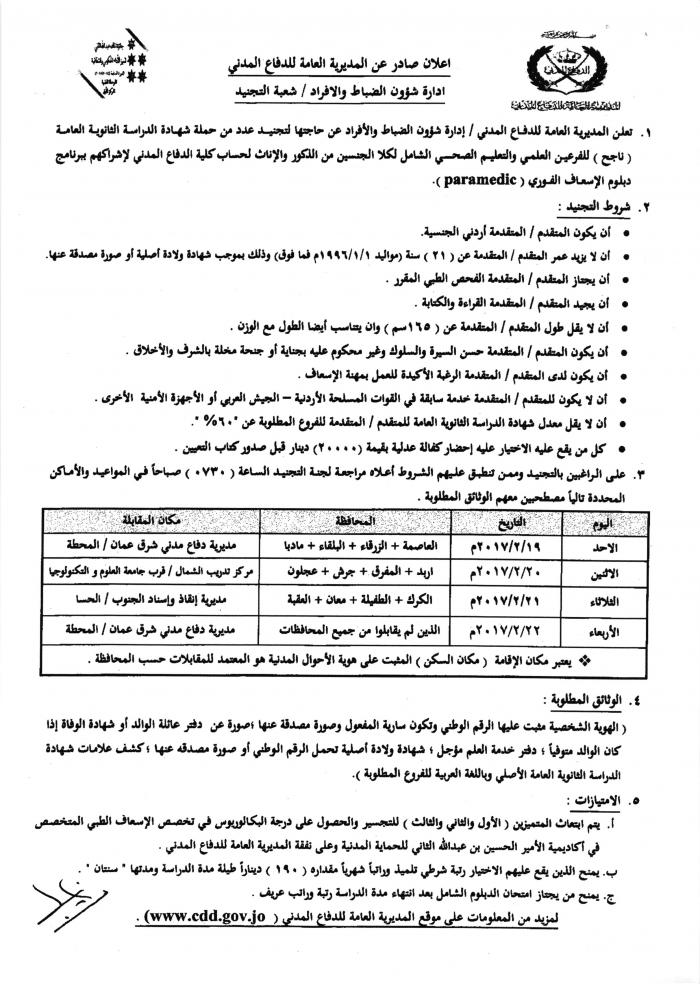 أعلنت المديرية العامة للدفاع المدني / ادارة شؤون الضباط والافراد عن حاجتها لتجنيد عدد من حملة شهادة الدراسة الثانوية العامة ( ناجح ) للفرعين العلمي والتعليم الصحي الشامل لكلا الجنسين من الذكور والاناث ،لحساب كلية الدفاع المدني لاشراكهم ببرنامج دبلوم الاسعاف الفوري .