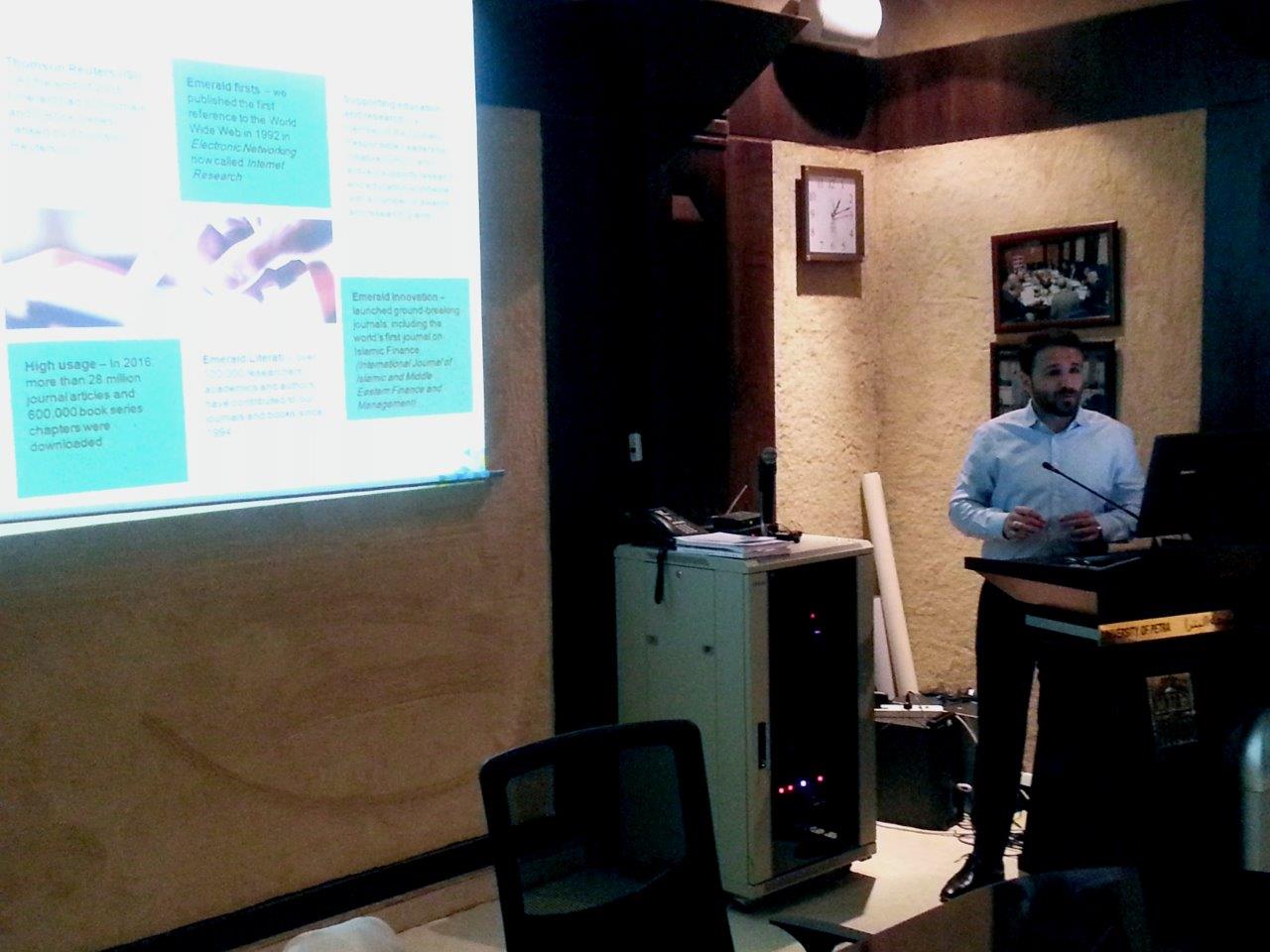 استضافت مكتبة جامعة البترا الممثل الإقليمي لقواعد بيانات "إمرالد"عبدالله محمود، ضمن ورشة عمل أقيمت في قاعة الاجتماعات بالمكتبة لاستعراض الدوريات المصنفة التي تضمها قواعد البيانات المتخصصة في مجالات العلوم الإدارية.