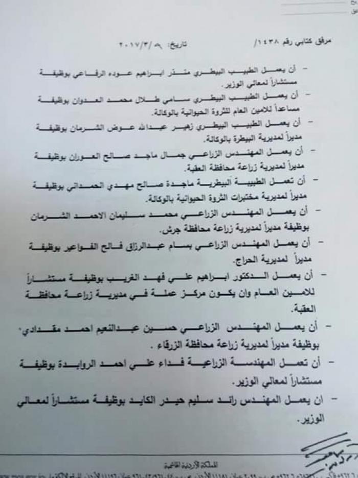 قرر وزير الزراعة المهندس خالد الحنيفات اجراء تنقلات في الوزارة لمقتضيات مصلحة العمل.