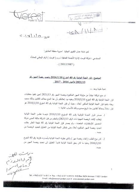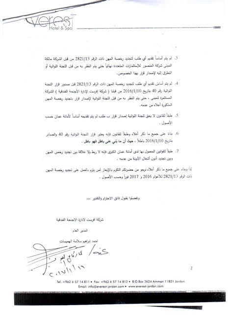 وزاد هميسات : تم تحويل استدعائنا إلى دائرة الشؤون القانونية بالأمانة وبعد دراسته صدر رأي قانوني في 22/2/2017 ، مفاده أن الطعن الذي المقدم من قبلي هو طعن صحيح وأنه لا يجوز لأمانة عمان استثناء مبنى إفرست واختلاق اشتراطات غير قانونية بحقه وأن على الأمانه الإلتزام بالتعاميم الصادرة عنها وعليه يجب تجديد الترخيص المهني .