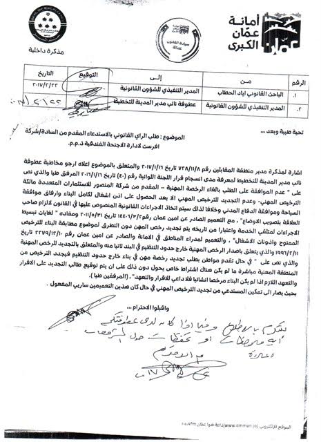 وعليه قامت دائرة المهن بتاريخ 11/3/2017 بإعادة عرض استدعائنا على أمين عمان المُقال للمشافهة ليتسنى لهم عرضها على اللجنة اللوائية كما ذكرنا لحضراتكم أعلاه ، إلا أنه استكبر ورفض إعادة النظر باستدعائنا مخالفاً بذلك القانون والأصول كعادته !!