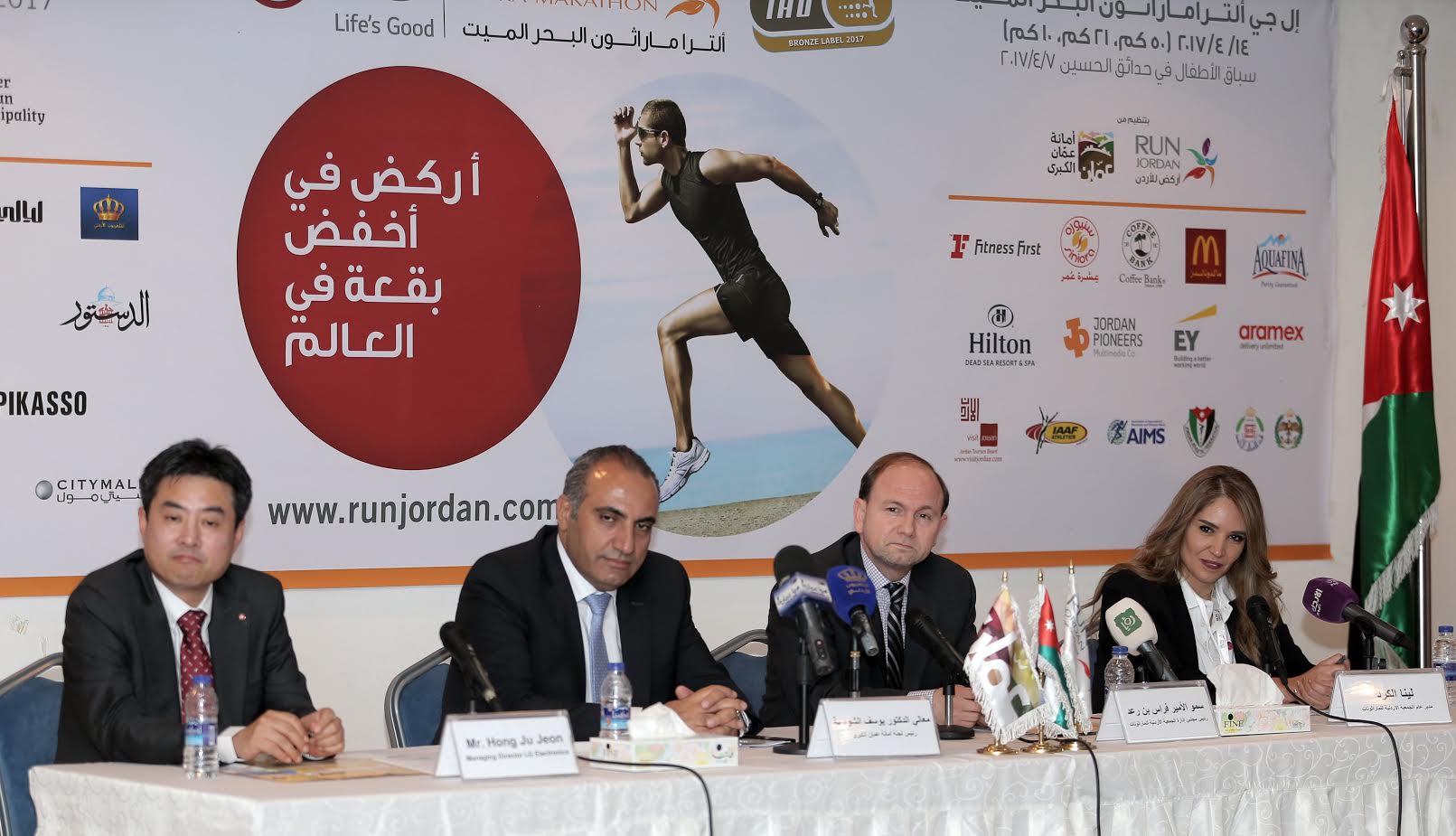 تحت رعاية سمو الأمير فراس بن رعد، أعلنت الجمعية الأردنية للماراثونات خلال مؤتمر صحفي، عن إطلاق فعاليات إل جي ألتراماراثون البحر الميت بنسخته الثالثة والعشرين، بحضور مدير عام شركة "إل جي إلكترونيكس" لمنطقة المشرق العربي، هونغ جو جون، ممثلاً عن "إل جي" الراعي الرسمي لهذا الماراثون، وأعضاء مجلس إدارة الجمعية الأردنية للماراثونات، إلى جانب عدد من الإعلاميين والعدائين المشاركين في ألتراماراثون البحر الميت لهذا العام، والذي سينطلق يوم الجمعة 14 نيسان 2017 تحت شعار "اركض نحو أخفض بقعة في العالم".