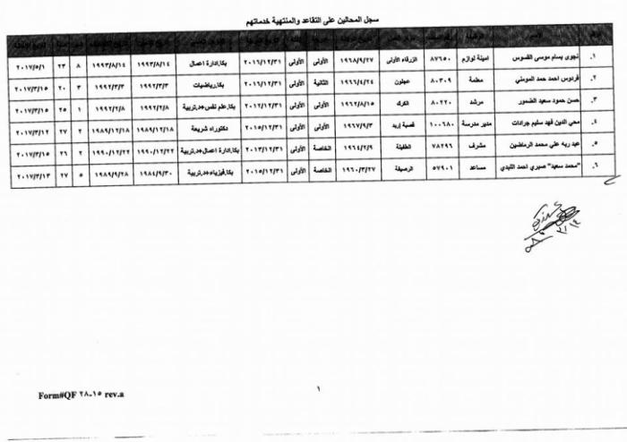 قرر مجلس الوزراء الموافقة على احالة عدد من المعلمين والعاملين في وزارة التربية والتعليم إلى التقاعد اعتبارا من التاريخ المبين ازاء كل منهم.وجاءت الاحالات الى التقاعد بحسب القرار بناء على طلب المحالين.