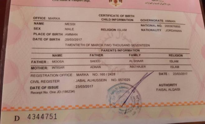 رزق مواطن أردني يقطن في العاصمة عمان بمولود ذكر في مستشفى البشير أطلق عليه اسم "ميسي"، بحسب ما قال والده.