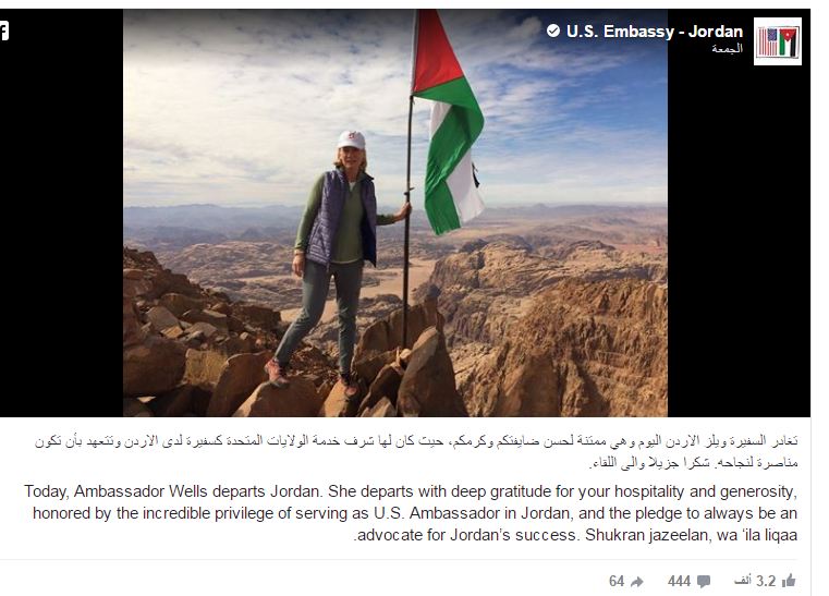 وكتبت السفارة الأمريكية في أخر منشور لها عن ويلز عبر صفحتها على مواقع التواصل الاجتماعي الفيس بوك "تغادر السفيرة ويلز الاردن اليوم وهي ممتنة لحسن ضايفتكم وكرمكم، حيث كان لها شرف خدمة الولايات المتحدة كسفيرة لدى الاردن وتتعهد بأن تكون مناصرة لنجاحه. شكرا جزيلا والى اللقاء".