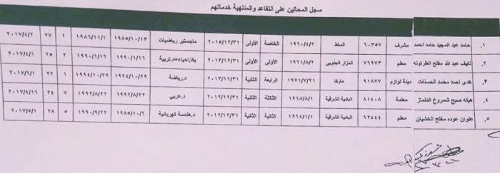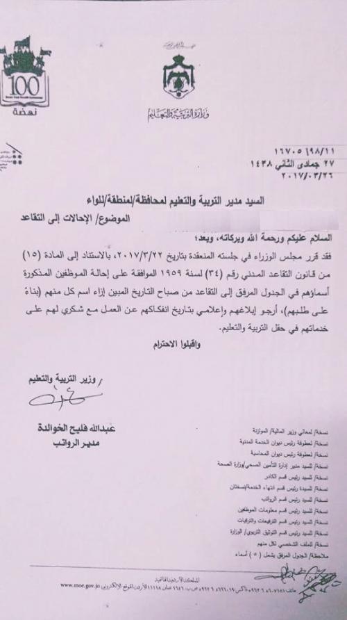 قرر مجلس الوزراء في جلسته المنعقدة بتاريخ 22/3/2017 وبناء على تنسيب وزير التربية والتعليم احالة 5 موظفين الى التقاعد بناء على طلبهم .وتاليا الاسماء:
