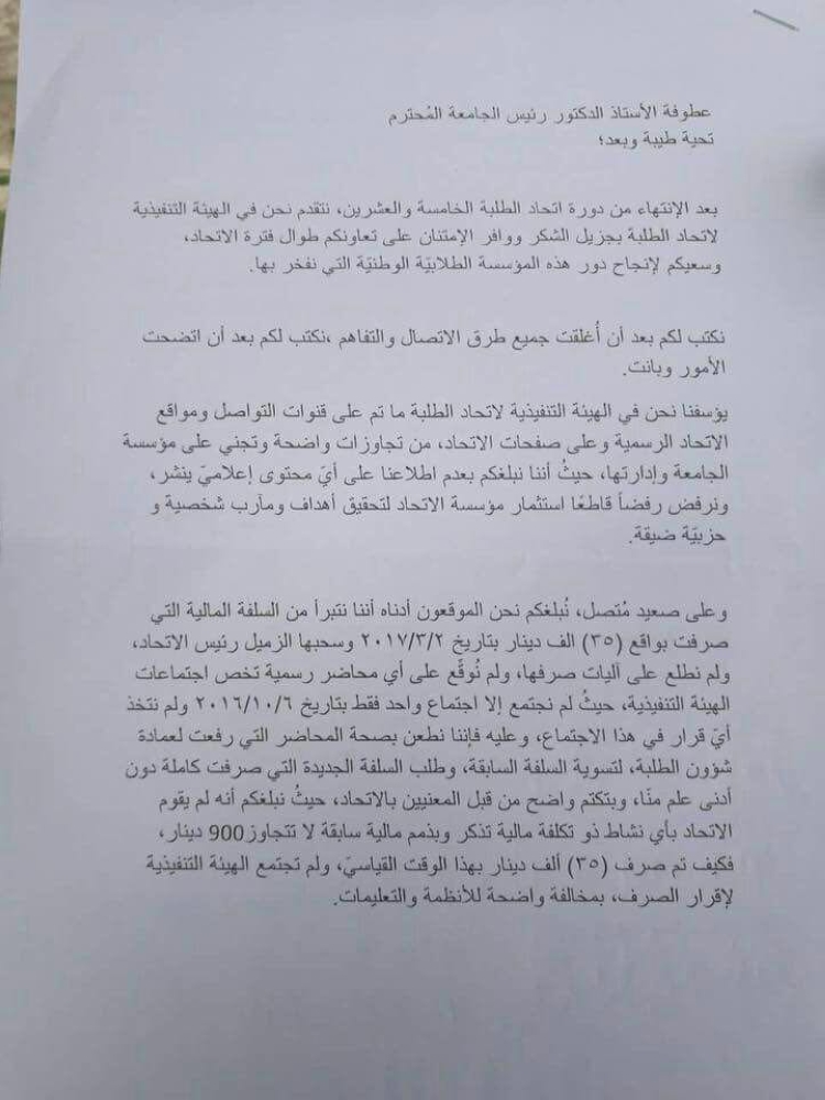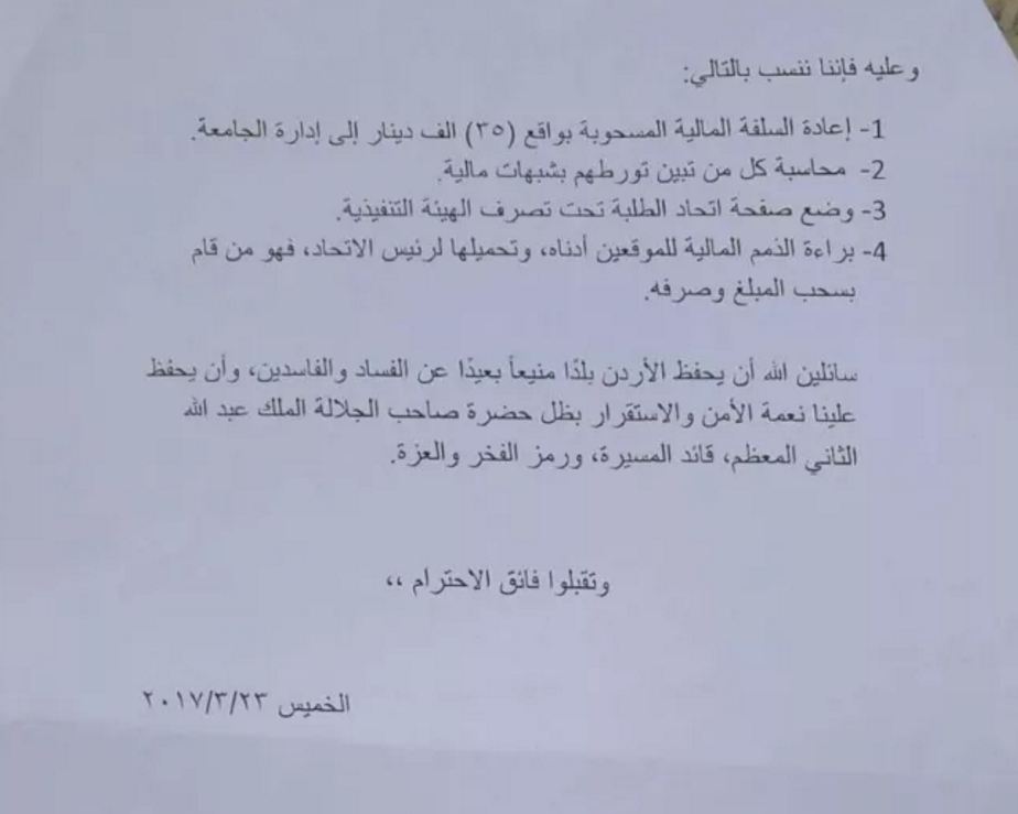 وطالب الموقعون على الكتاب اعادة السلفة المالية المسحوبة بواقع 35 الف دينار الى ادارة الجامعة ، ومحاسبة كل من تبين تورطه بشبهات مالية ، ووضع صفحة اتحاد الطلبة تحت تصرف الهيئة التنفيذية ، وابراء الذمم المالية للموقعين ادناه وتحميلها لرئيس الاتحاد فهو من قام بسحب المبلغ وصرفه وفق ادعائهم .