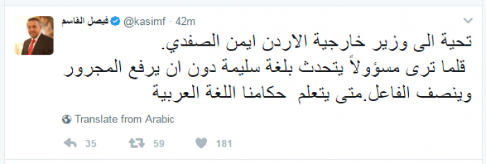 حيا الاعلامي السوري المعروف فيصل القاسم، وزير الخارجية الأردني ايمن الصفدي .وقال القاسم عبر تغريدة له على تويتر 'قلما ترى مسؤولاً يتحدث بلغة سليمة دون ان يرفع المجرور وينصب الفاعل'.وختم متسائلاً: متى يتعلم حكامنا اللغة العربية؟