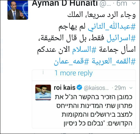 فما كان من الزميل ايمن الحنيطي، الخبير بالشؤون الاسرائيلية الا ان رد عليه سريعا بالعبرية قائلا : "الملك عبدالله الثاني، لم يهاجم اسرائيل فقط بل قال الحقيقة، اسالوا جماعة حركة السلام الان عندكم لتتاكدوا " .