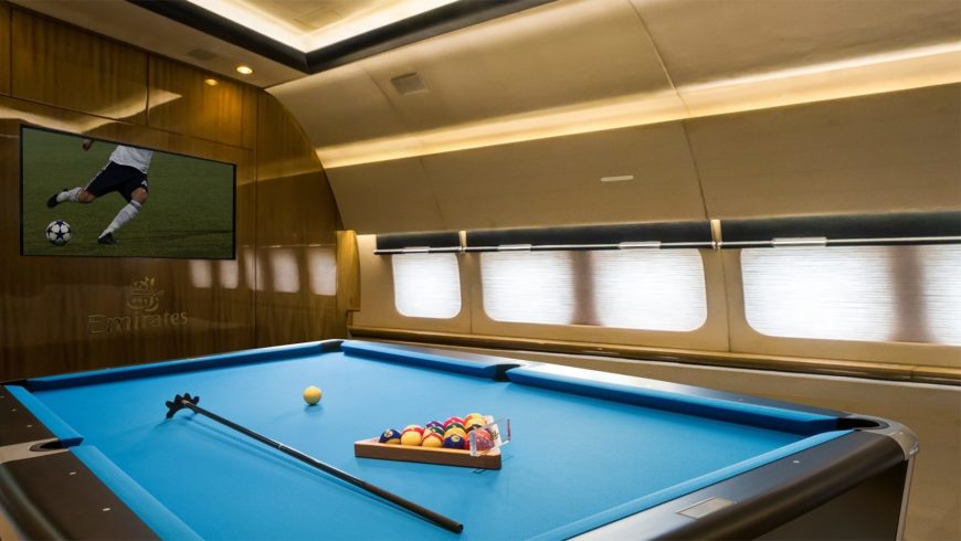 كشفت في الإمارات، عن خطط لإنشاء أكبر طائرة تجارية في العالم، مؤلفة من طوابق ثلاثة، وتضم حمام سباحة إضافة لصالة ألعاب رياضية.