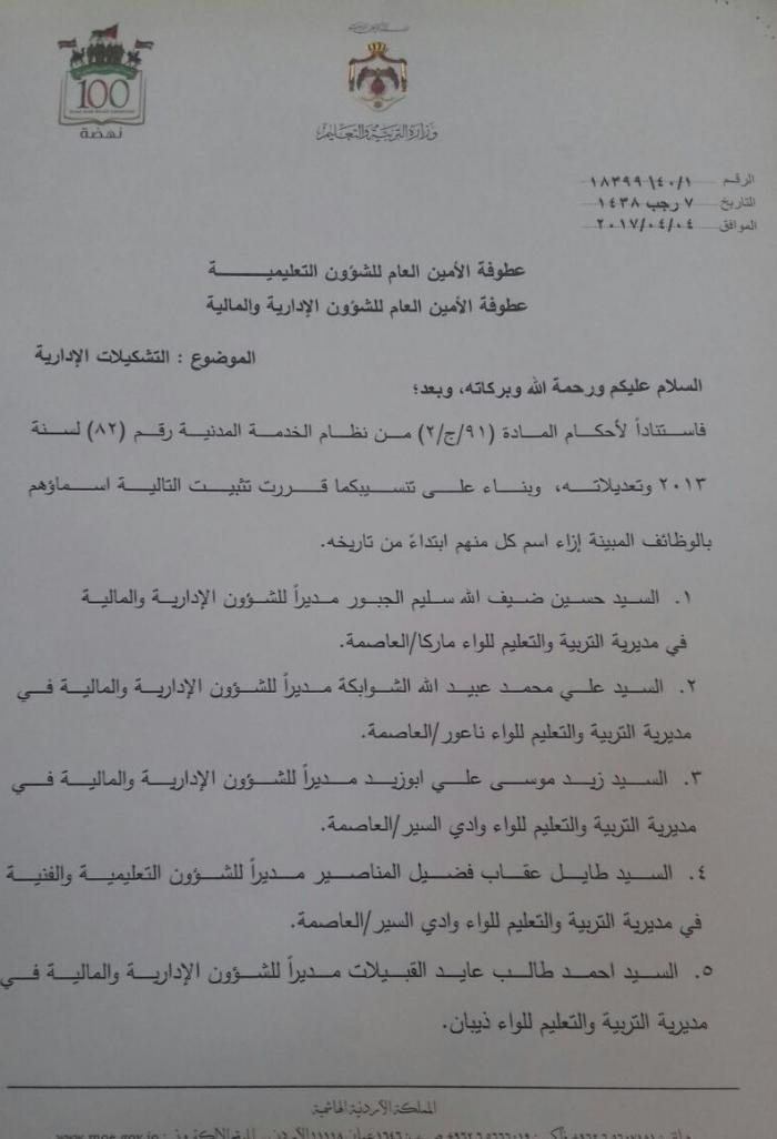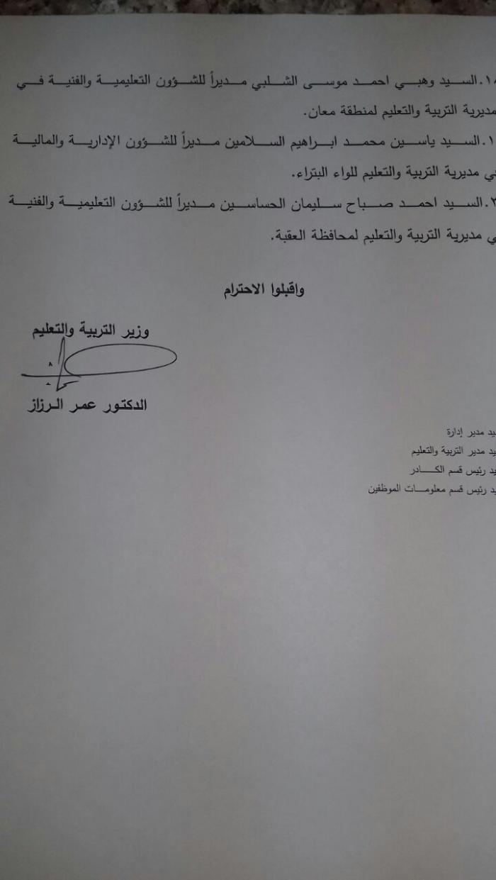 قرر وزير التربية والتعليم الدكتور عمر الرزاز اجراء تنقلات شملت عددا من المديرين الاداريين ضمن ملاك الوزارة.