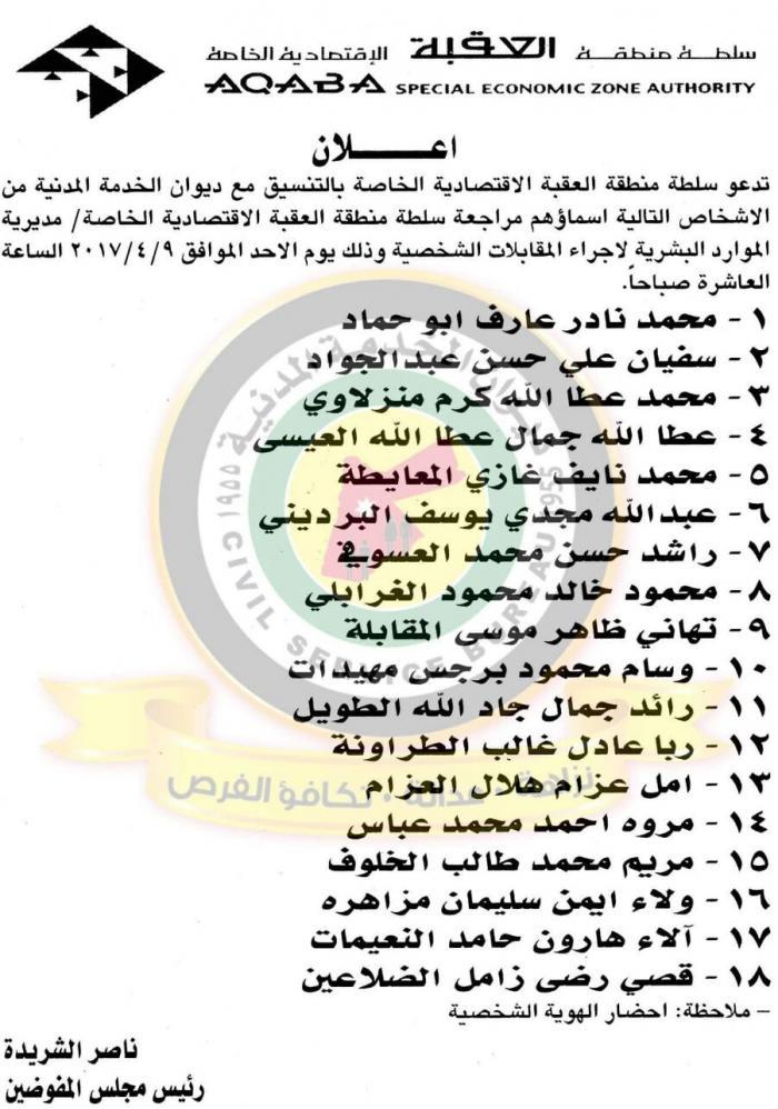 ودعت كذلك سلطة منطقة العقبة الإقتصادية التالية أسماؤهم من أجل اجراء المقابلة الشخصية: