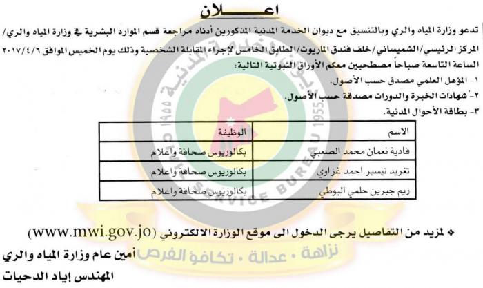 دعت وزارة المياه والري التالية أسماؤهم لمراجعة قسم الموارد البشرية في الوزارة من أجل إجراء المقابلة الشخصية:
