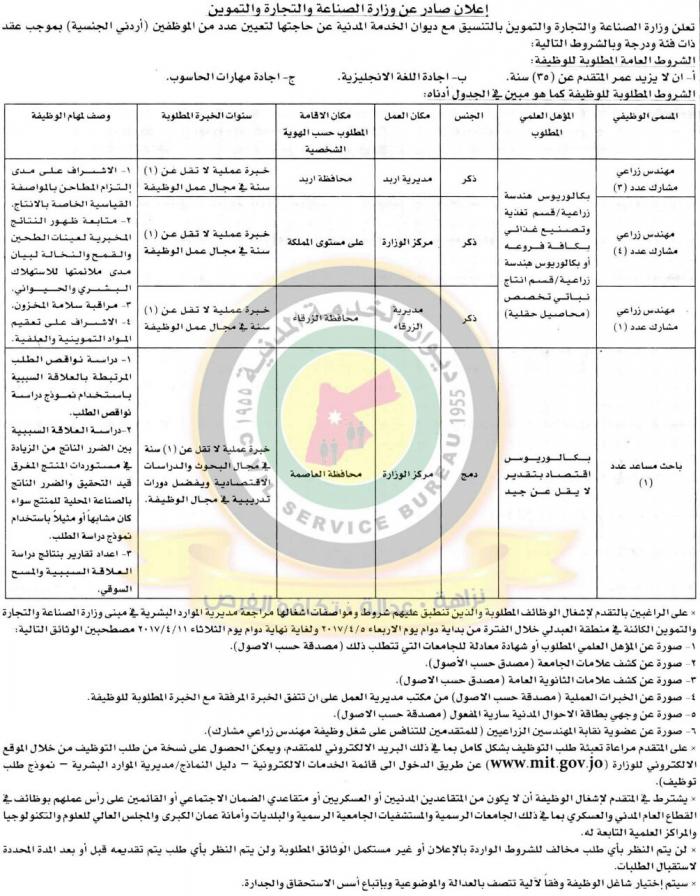 أعلنت وزارة الصناعة والتجارة والتموين عن حاجتها لتعيين عدد من الموظفين بموجب عقد بفئة ودرجة وبالشروط التالية: