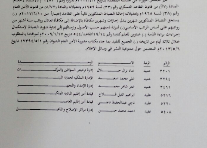 قرر مجلس الوزراء في جلسته المنعقدة بتاريخ ۲۰۱۷/٤/۲ احالة ٥۸ ضابطا الى التقاعد شملت رتبة عميد وعقيد ومقدم ورائد ونقيب وملازم.