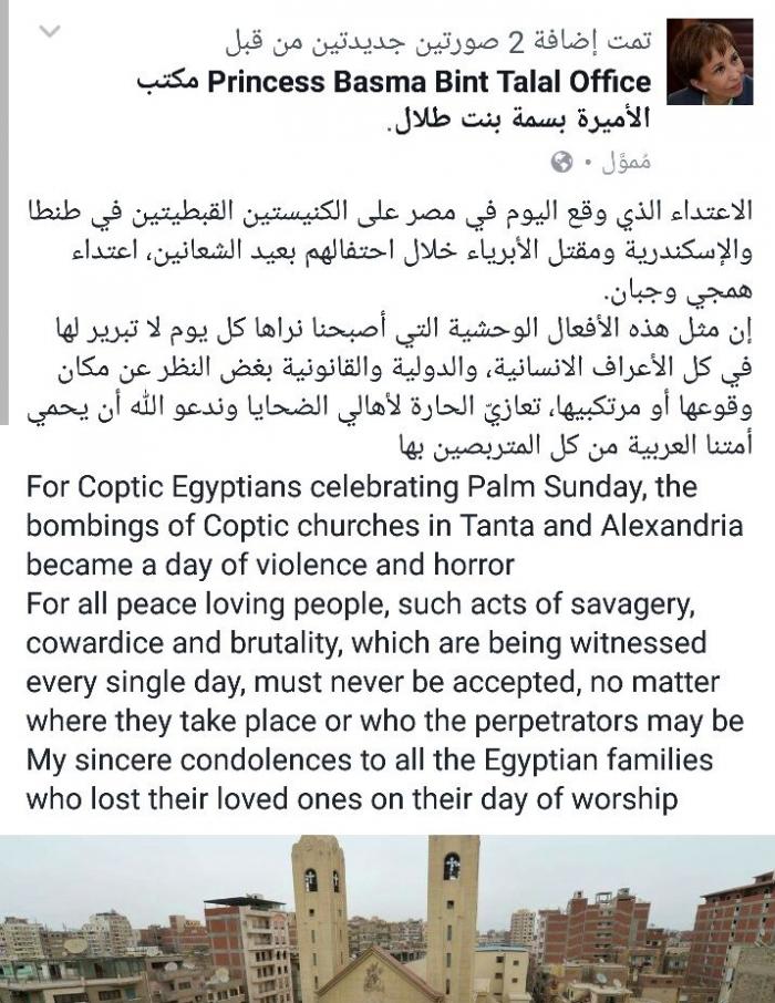 كتب مكتب الأميرة بسمة بنت طلال على صفحته الرسمية على موقع التواصل الاجتماعي الفيسبوك استنكاراً للهجوم الإرهابي الذي وقع في مصر على الكنيستين القبطيتين يوم امس الأحد، وتالياً نص المنشور: