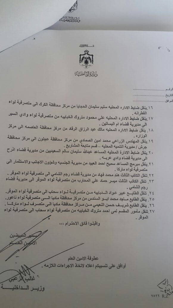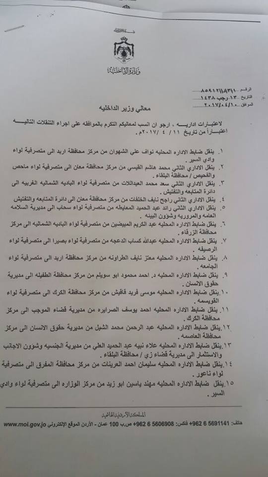 الغى وزير الداخلية غالب الزعبي قرار وزير الداخلية السابق سلامة حماد القاضي باجراء مناقلات بين عدد من الموظفين من مختلف الرتب الى مراكز المحافظات والمتصرفيات والاقضية المختلفة التابعة للوزارة